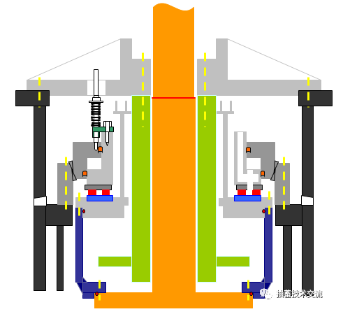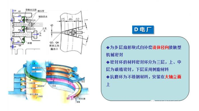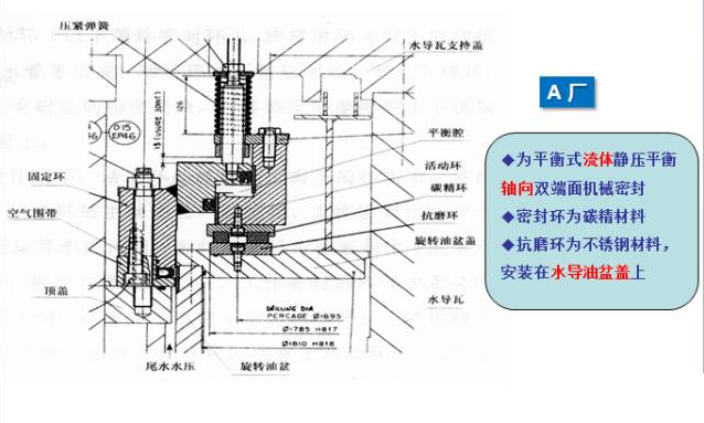 利用主轴密封供水(13~15bar)压住尾水(7~11bar);流进密封内环的水将自流漫过密封的上部,通过顶盖上的排水管将水排至集水廊道;流进外环的水则与尾水相抵,由于冷却供水压力高于尾水来的压力,起到密封的作用。