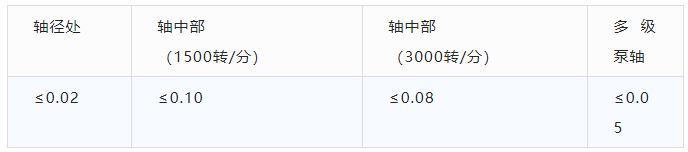 (2)轴弯曲超过允许值可采用机械法或加热法进行校直。轴允许跳动值如下表所示(单位:mm):